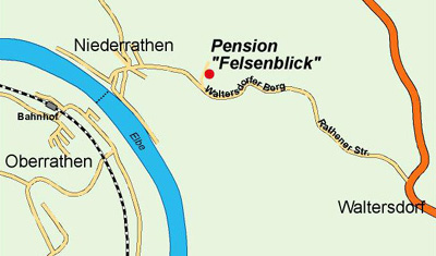 Überqueren Sie die Elbe mit der Fähre und gehen Sie die Ortsstraße geradeaus. Zirka 100 m nach dem Haus des Gastes / Feuerwehr auf der linken Seite erreichen Sie die Pension Felsenblick.